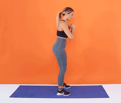 - Hinge at your hips, slightly bend your knees, and lower into a mini squat.