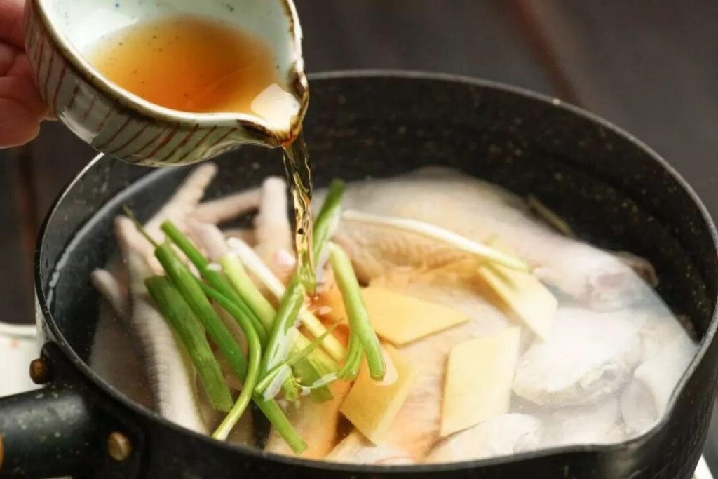 2、The Blanch (Key Step): In a large pot, add cold water, 2 spring onion segments, 4 slices of ginger, and 30g of cooking wine. Add the chicken pieces, bring to a boil, and cook for 3-5 minutes. This step removes impurities and ensures a clear, clean-tasting final broth. Drain and rinse the chicken under cold water.