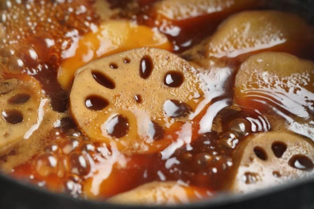 3、In a small saucepan, bring a portion of the cooled master braising liquid to a boil. Add the lotus root and potato slices. Simmer for about 5 minutes, or until just tender but still retaining a bite. Remove with a slotted spoon.