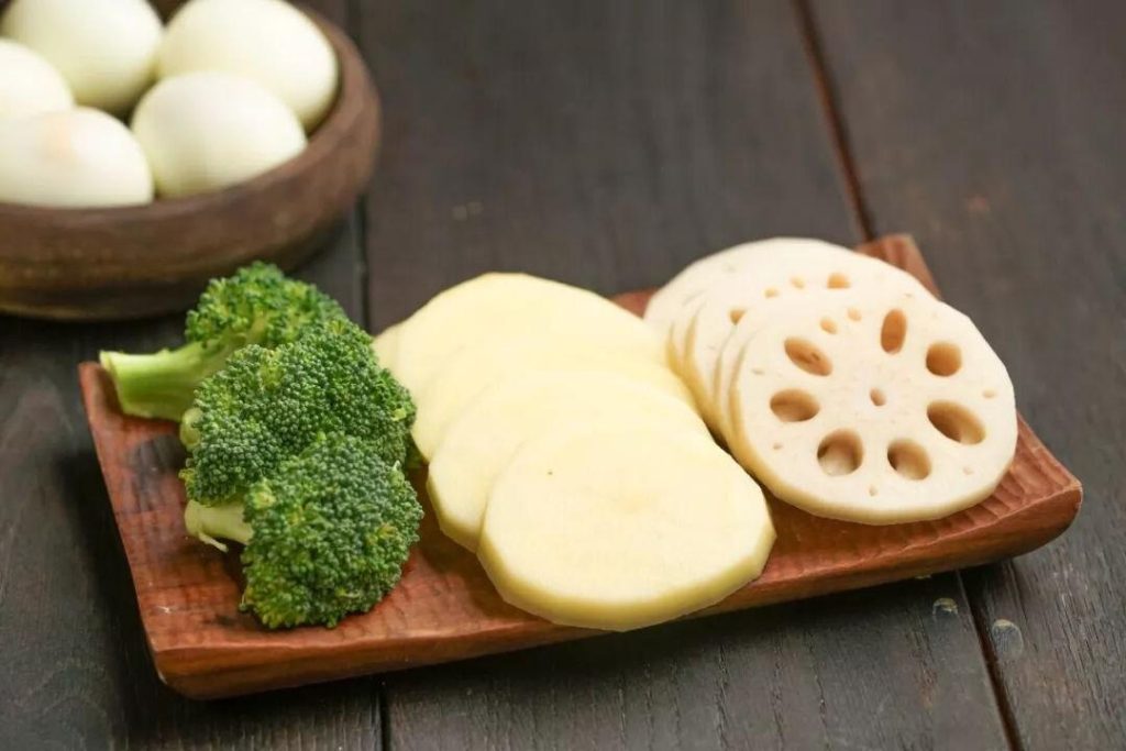 1、Prepare 100g each of broccoli florets, lotus root slices, and potato slices.