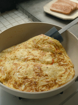 Increase heat to medium and cook for about 3 minutes, or until the egg base is mostly set. Here comes the fun part: confidently slide a wide spatula under the entire creation and flip it over in one smooth motion. You should now have bread-side down.