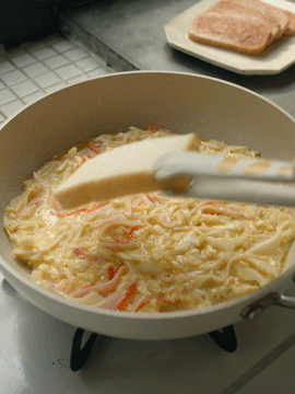 In a large bowl, combine the shredded cabbage, shredded surimi stick, eggs, salt, and black pepper. Mix well until everything is evenly coated in the egg mixture.