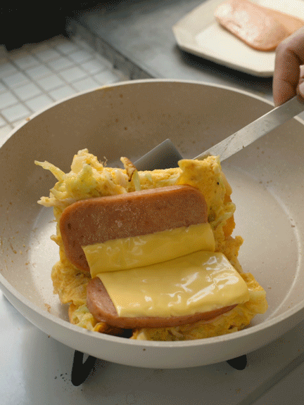 This isn’t just any sandwich. It’s a golden, hearty breakfast sandwich built in a pan. Imagine crispy-edged bread embracing a soft, flavorful omelet packed with crunchy cabbage and savory surimi (imitation crab stick), all layered with seared SPAM and melting cheese. It’s a full meal that feels like a warm hug for your soul. Consider this your golden key to breaking free from the duvet’s dungeon.