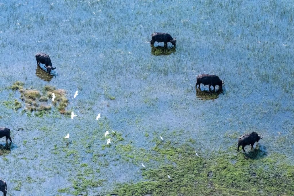 From the air, the landscape reveals its full beauty—an intricate web of waterways, islands, and floodplains. During the dry season, it’s even possible to see animal herds migrating along natural water corridors that resemble lifelines across the land.