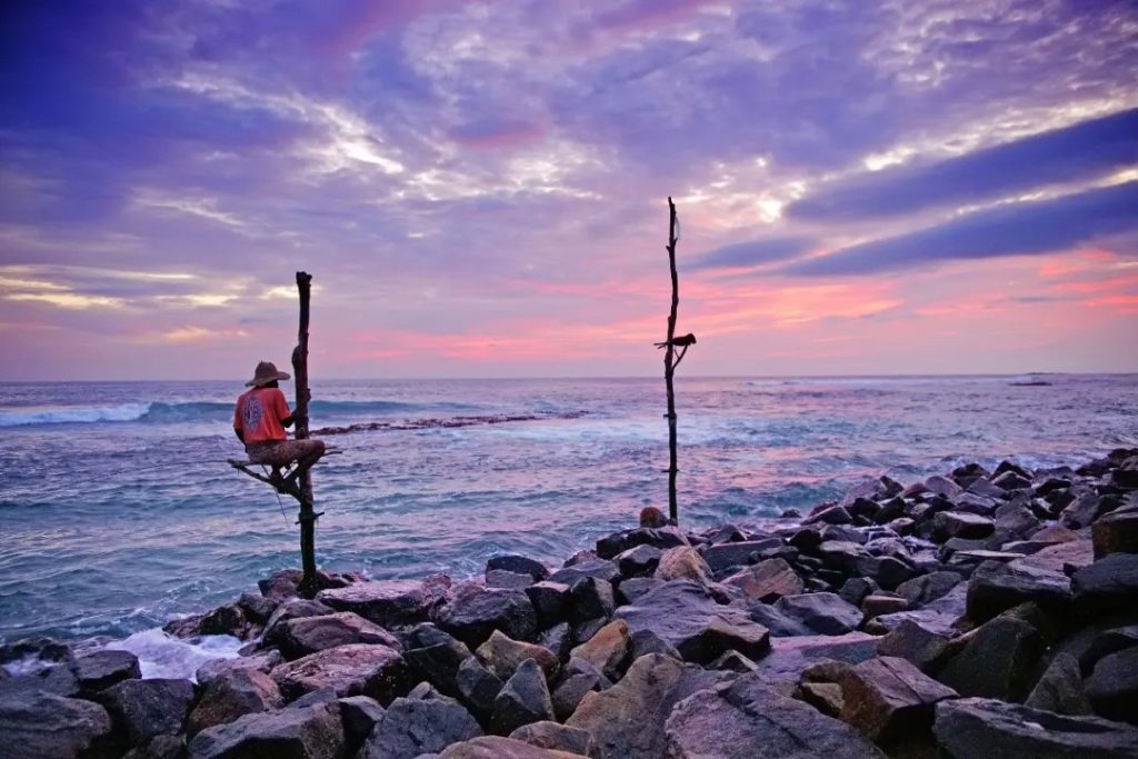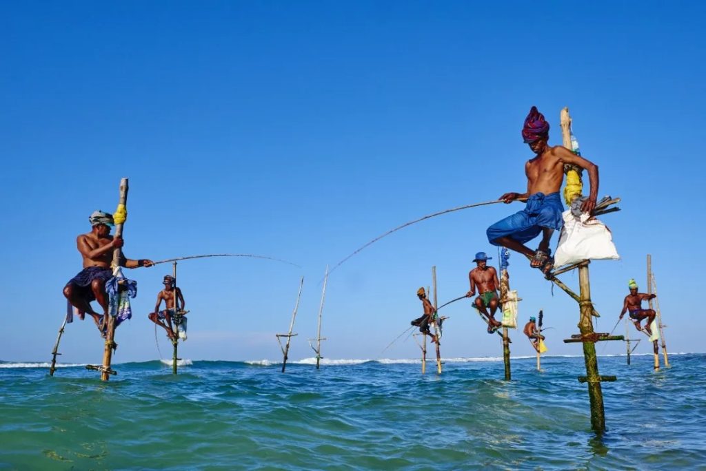 One of the island’s most fascinating coastal traditions is stilt fishing, where fishermen perch on tall wooden poles in the ocean, patiently waiting for their catch.