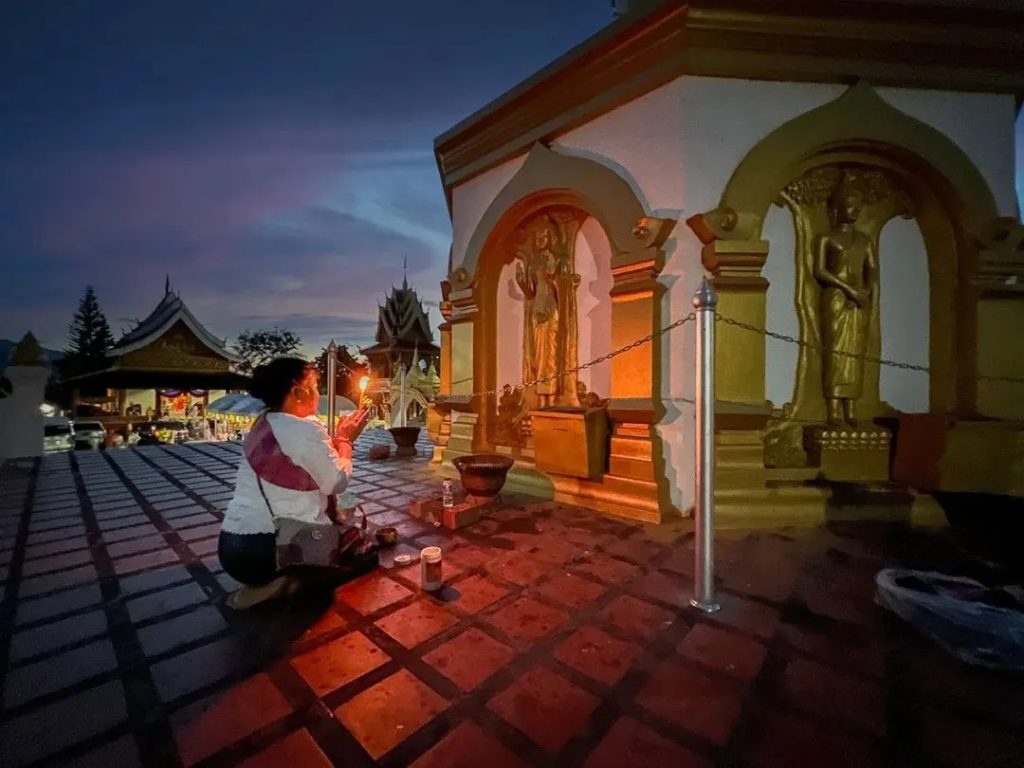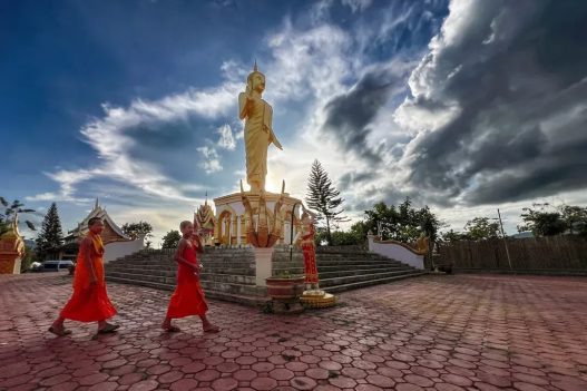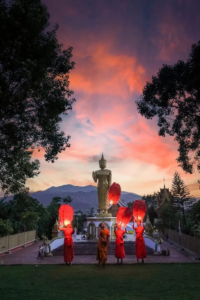 At a local temple—such as Phoutat Stupa—visitors may witness a magical lantern release ceremony. As glowing lanterns rise slowly into the night sky, they resemble stars drifting upward, carrying wishes and dreams with them.