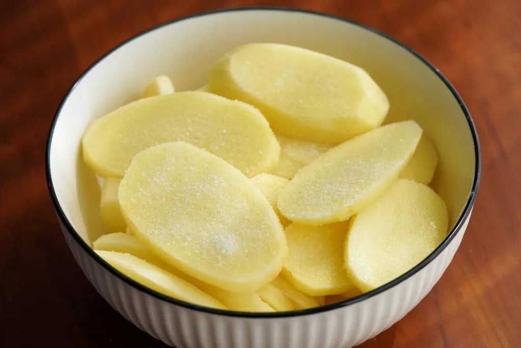 In a bowl, toss the potato slices with 1 tablespoon of salt. Massage gently to coat evenly. Let sit for 20 minutes. The salt draws out moisture and softens the potato’s structure, making it pliable enough to bend without breaking. After 20 minutes, the slices should be flexible, not brittle.