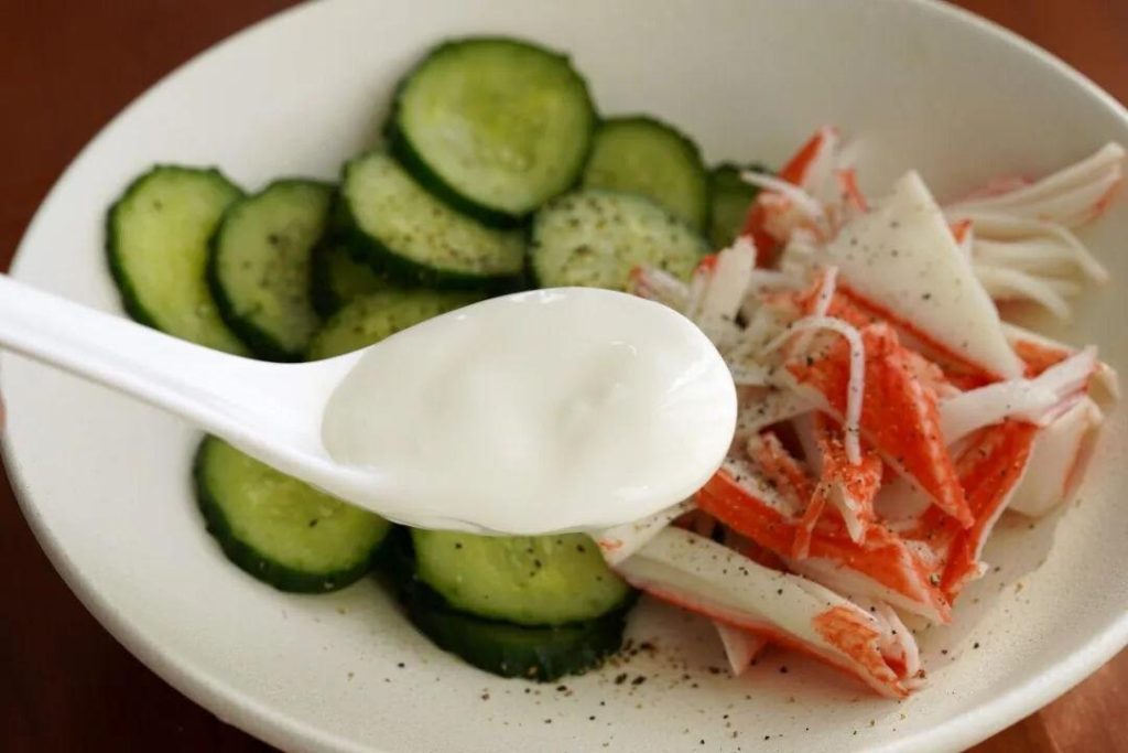 Add the shredded crab sticks and yogurt to the cucumber. Mix until well combined. Taste and adjust seasoning if needed.