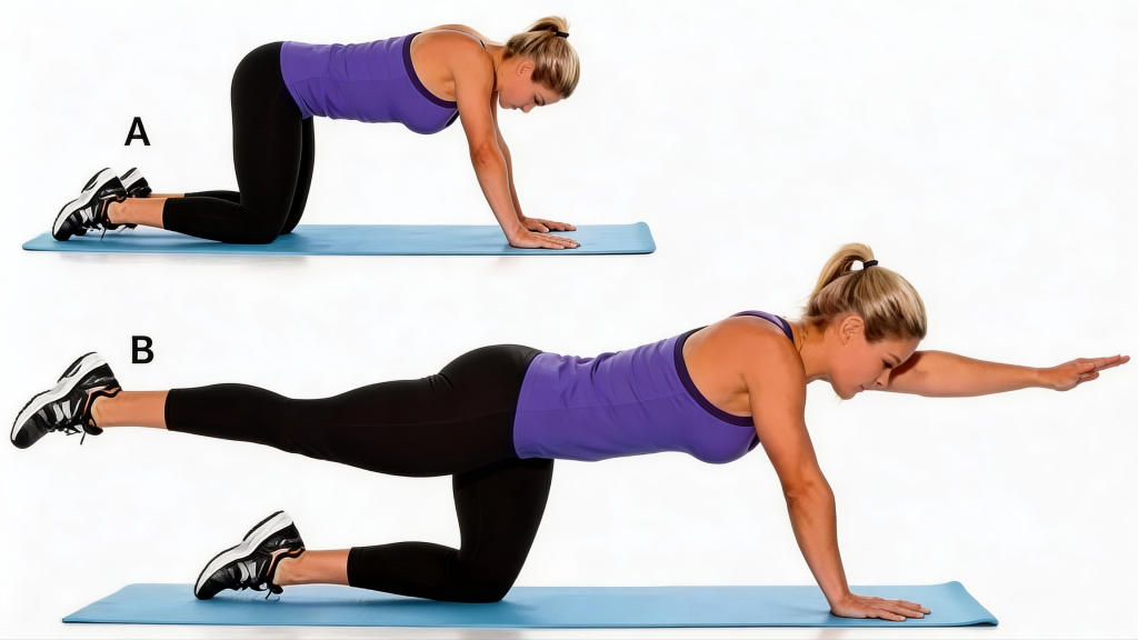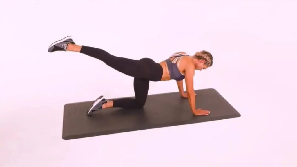 From an all-fours position, engage your core and extend your right leg straight back, pointing your toes.