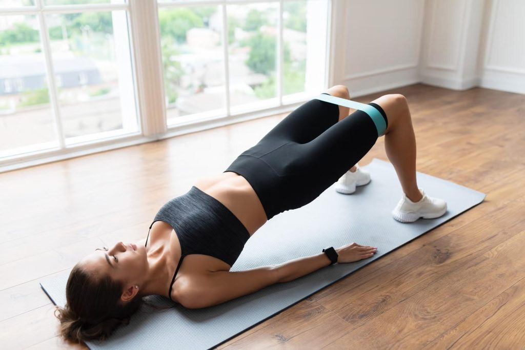 Lie on your back with your feet flat on the floor and knees bent. Place a resistance band around your thighs and lift your heels slightly.