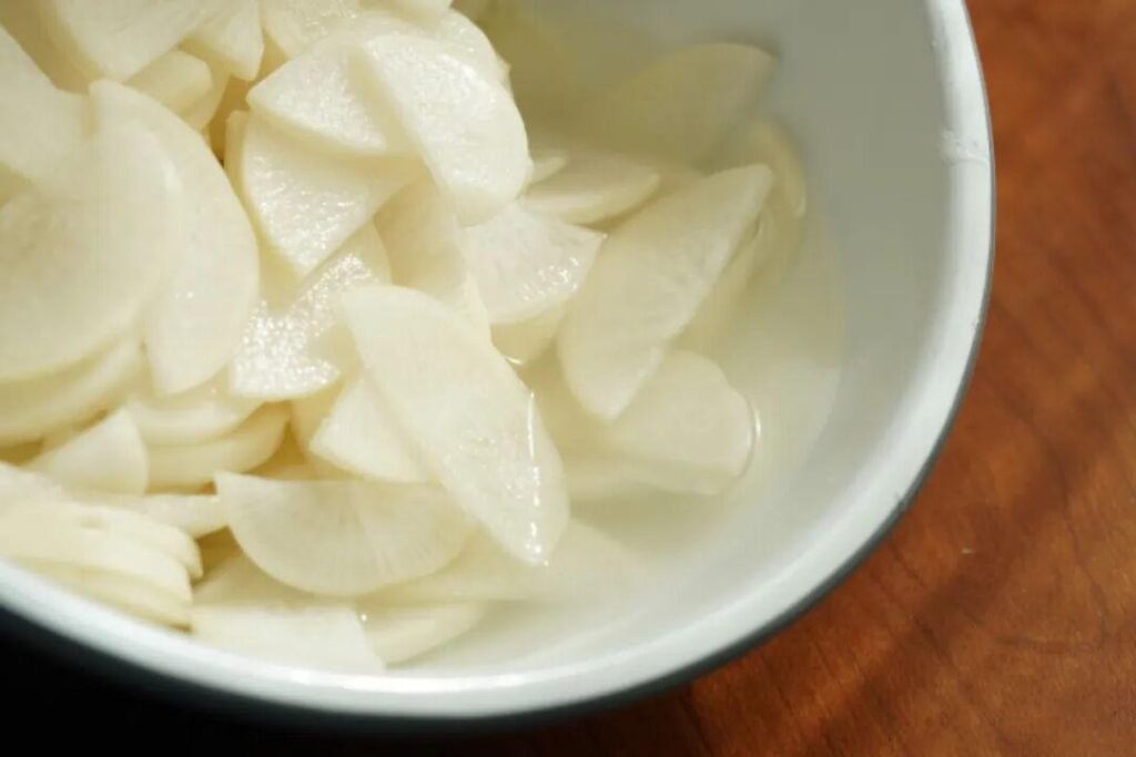 1、准备1公斤萝卜,洗净,去掉两端,纵向切成两半。然后,将其切成薄薄的半月形。放入一个大碗中,加入 1 汤匙盐和 1/2 汤匙糖。静置 1 小时以吸出多余的水。沥干液体并冲洗萝卜片。