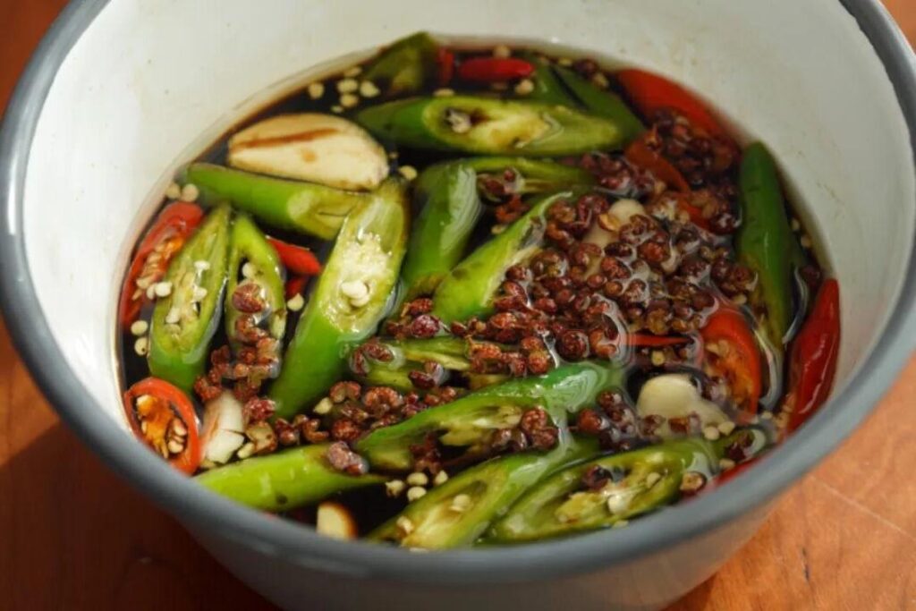 • 注入油:在小平底锅中用中火加热 2 汤匙油。添加1汤匙四川花椒让它们发出嘶嘶声 5 秒钟,然后将全部内容物倒入调料中。搅拌均匀。