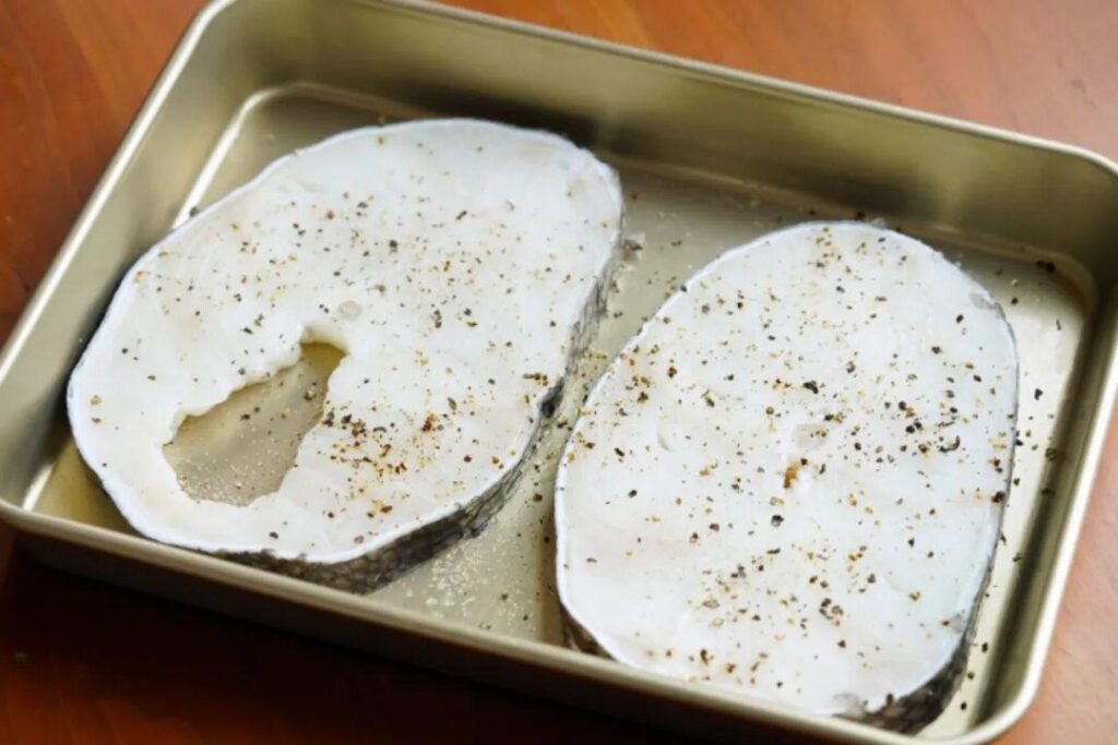 1、将2块解冻的鳕鱼片拍干。用 1/2 茶匙盐和少量黑胡椒粉给两面调味。如果有的话,挤一点柠檬汁是一个很好的补充。让它腌制 15 分钟。