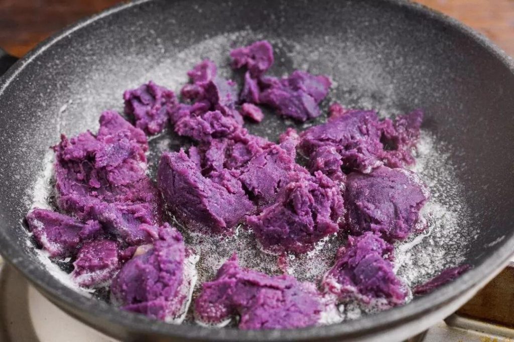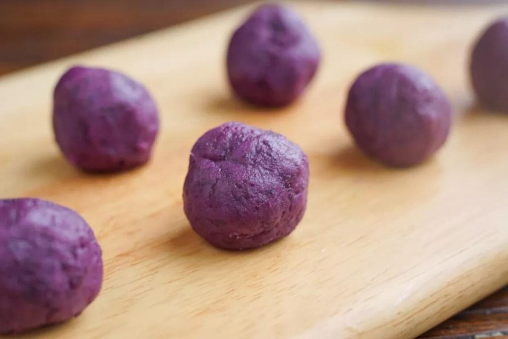 将紫薯蒸20分钟至软。去皮并捣碎。在小平底锅中用小火融化 15 克无盐黄油。加入紫薯泥、1汤匙炼乳和3汤匙浓奶油。搅拌直至光滑并充分混合。待冷却,然后搓成17克的球。