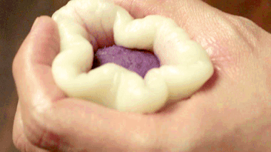 和抹茶麻糬一样。弄湿你的手。将白色麻糬面团分成34克一份。压扁,放入紫薯馅团,包紧。