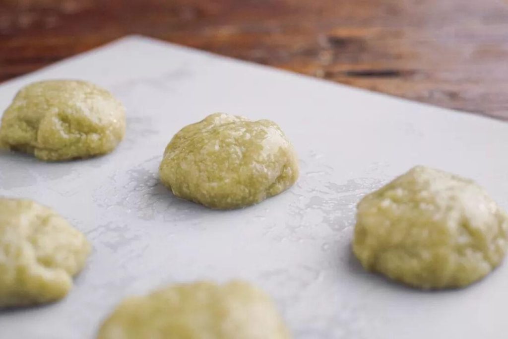 当面包机发出蜂鸣声时,打开盖子,冷却约5分钟。用冷水轻轻润湿双手(防止粘连)。取出绿色麻糬面团。放置在硅胶垫或涂有少许油的表面上。分成34克一份。将每个滚成球状,然后用手掌压平成圆盘。