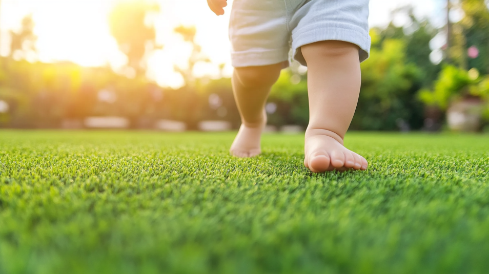 - Bei Sonnenschein: Lassen Sie Ihr Kind auf sauberem Gras oder Sand tapsen – das fördert die Sinneswahrnehmung.