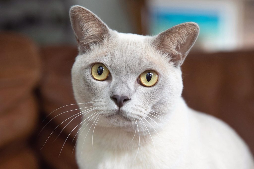 Die Burma-Katze hat ein rundes Gesicht mit leicht abgeflachtem Profil, große goldene Augen und eine kurze Nase.