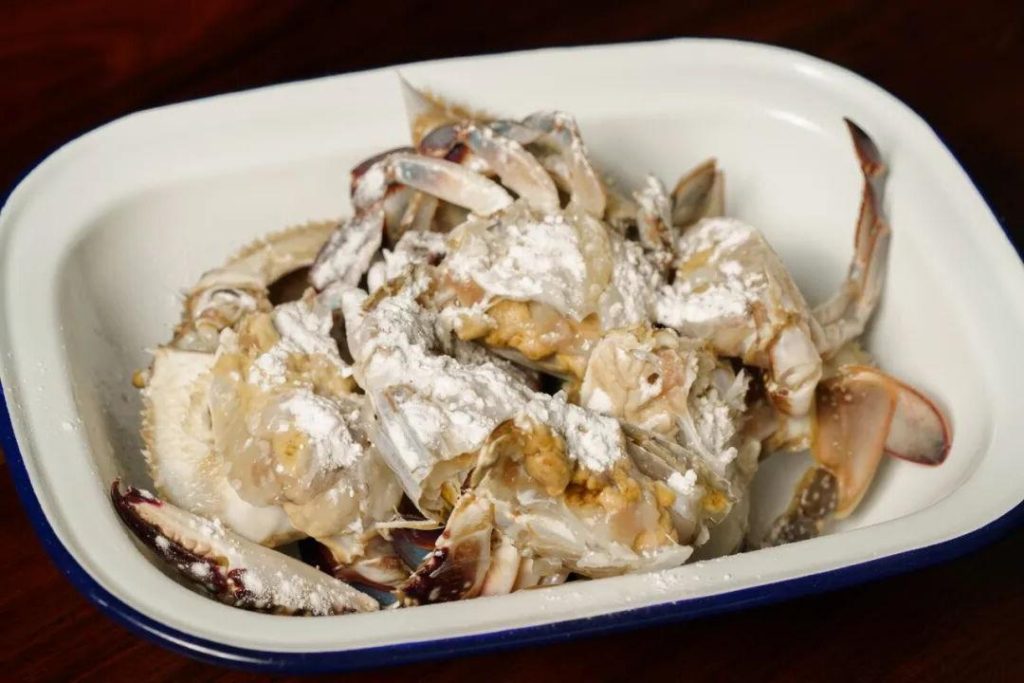 In einer Schüssel die Krabbenstücke und die zurückbehaltenen Schalen mit Maisstärke vermengen, bis sie gleichmäßig bedeckt sind. Diese dünne Schicht sorgt für Knusprigkeit und sorgt für eine gute Haftung der Soße.