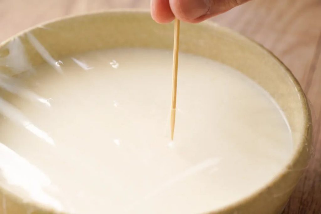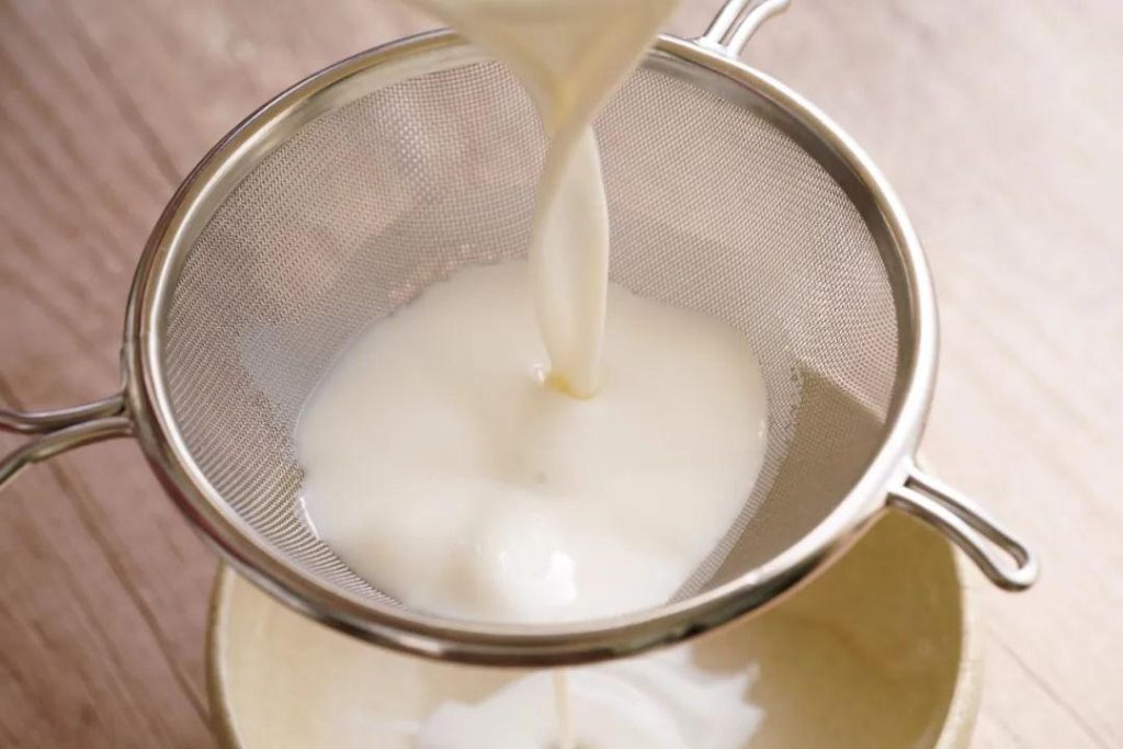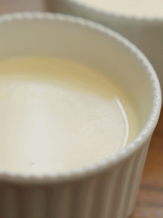 3 、La tensión y el asentamiento:Cuele la mezcla a través de un colador fino para eliminar los grumos y luego divídala en 6 moldes (140 ml cada uno).
