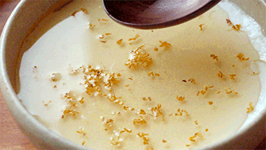 4 、El toque final:Deje enfriar un poco y luego rocíe con el aromático jarabe de osmanthus.
