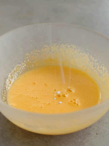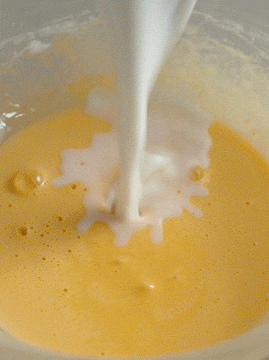 4、Vierta poco a poco la leche tibia en la mezcla de huevo mientras bate constantemente para evitar que se cuaje.