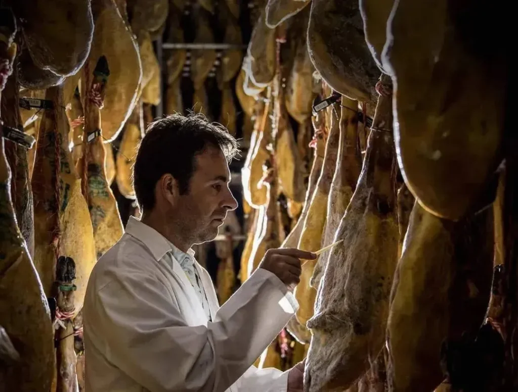 Transformar una pierna fresca en sublimeJamónEs un ejercicio de paciencia y habilidad, guiado por la naturaleza. Una vez que el cerdo alcanza la madurez, se recortan cuidadosamente las patas traseras, con un característico corte en “V” cerca de la pezuña para facilitar el curado. Luego se entierran en sal marina gruesa, se lavan y comienzan su largo sueño en bodegas de curación naturales.