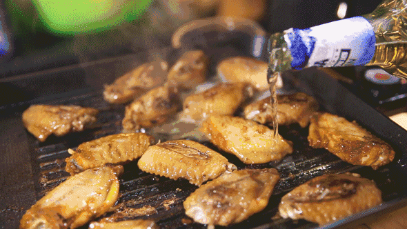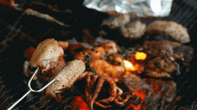 PolloEstá en todas partes y es barato. Con cinco dólares se puede comprar una bolsa enorme de alitas congeladas. Márquelos, déjelos marinar y luego cubralos con cebollas, champiñones y esas enormes berenjenas americanas en la rejilla inferior. Absorben la grasa de arriba y se convierten en los bocados más codiciados de todos.