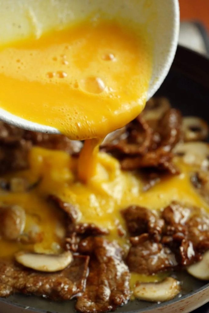 Remettez le bœuf dans la poêle avec les champignons. Répartissez le tout uniformément. Versez le mélange d’œufs par-dessus.
