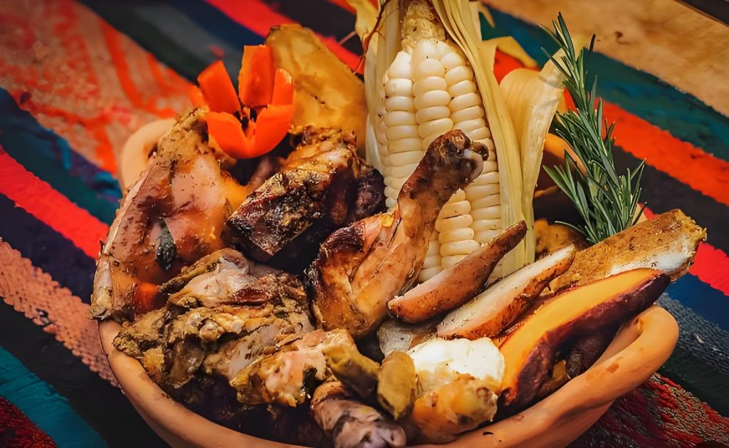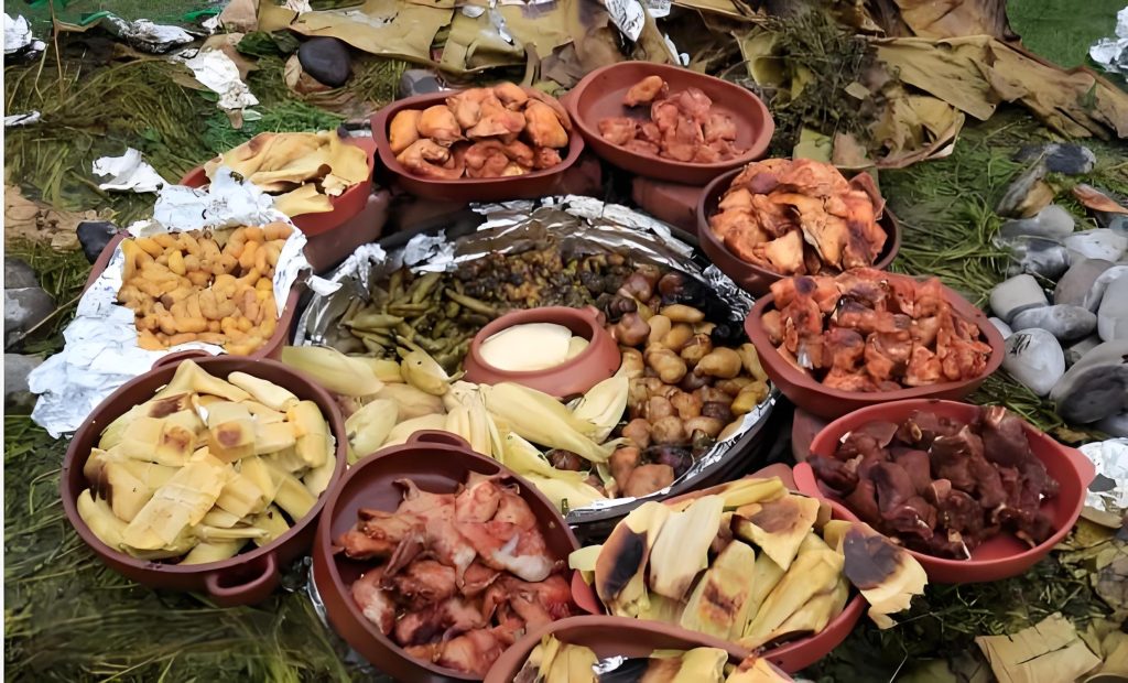 Il s’agit d’un plat de fête, traditionnellement réservé aux occasions spéciales. Diverses viandes, maïs, pommes de terre et légumes sont enterrés dans une fosse bordée de pierres. Un feu est allumé en dessous et tout cuit lentement. Parfois, la truite locale est également cuite de cette façon.