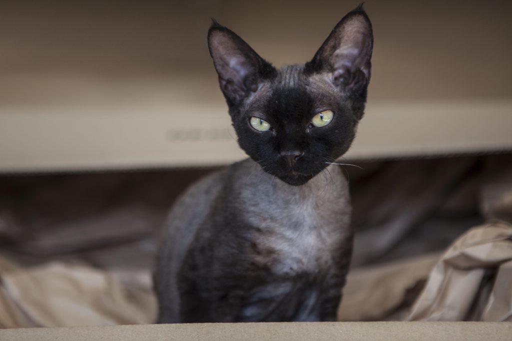 Si vous recherchez un chat noir à l’apparence unique, le Devon Rex se démarque par son pelage doux et bouclé et ses caractéristiques distinctives, presque extraterrestres.