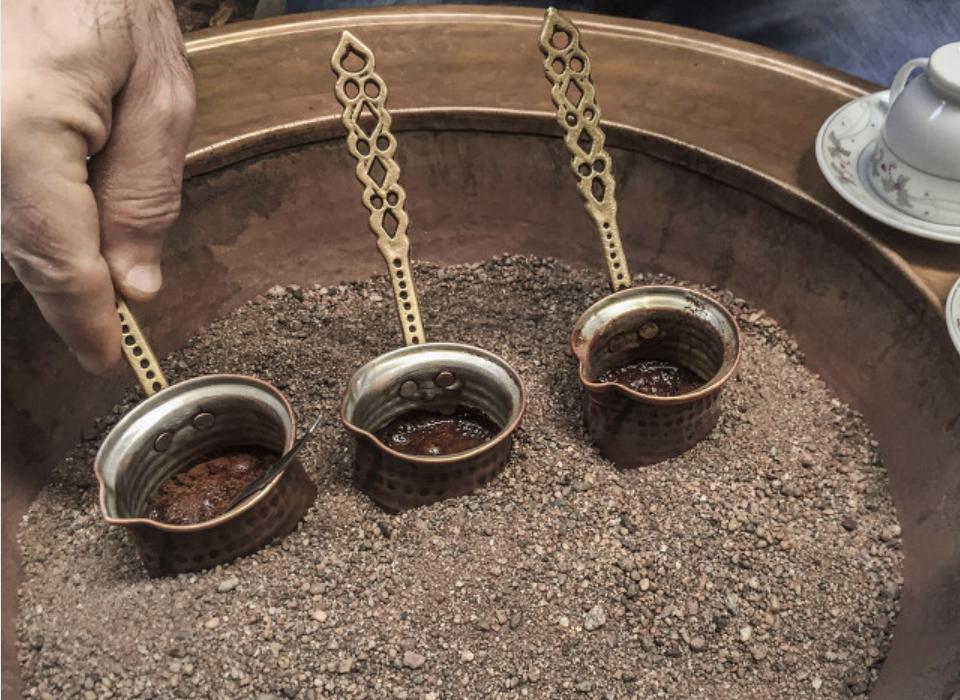 伝統的トルココーヒーと呼ばれる小さな柄の長い銅製の鍋で調理されます。コーヒーポット。ホットサンドを敷いたトレイでゆっくりと加熱するため、直火を使わずに非常に均一で制御された加熱が可能です。バリスタがポットの手入れをし、コーヒーが泡立ち、上昇するのを待つのを見ること自体が瞑想です。