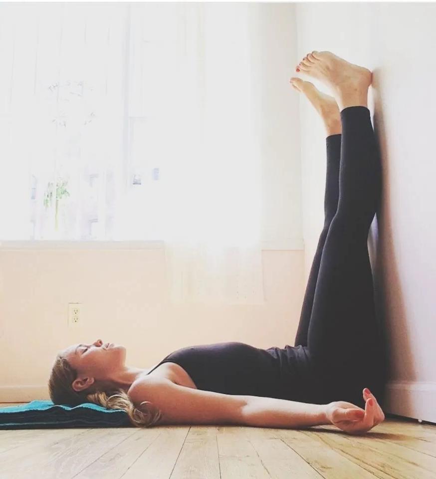 仰向けに寝て、足を壁に向かってまっすぐ伸ばします。心地よいと感じる場合は、腰を壁に軽く触れるように近づけます。ここに10〜15回ゆっくりと呼吸してください。