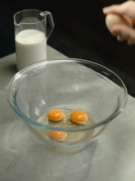 - 큰 믹싱볼에 계란, 우유, 설탕, 소금을 넣고 완전히 섞일 때까지 휘젓습니다.
