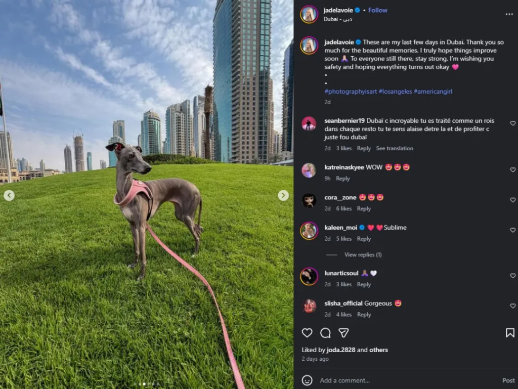 반면, 인플루언서 제이드 라부아(Jade Lavoie)는 개인 제트기를 타고 두바이를 떠나 애완동물을 데리고 온 것으로 알려졌습니다.