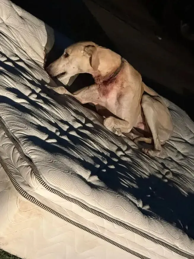 자원봉사자들은 충격적인 장면을 목격하고 있다. 한 사람은살루키길가의 매트리스에 묶여 있습니다. 목줄이 개의 목을 깊게 파고 있었습니다.