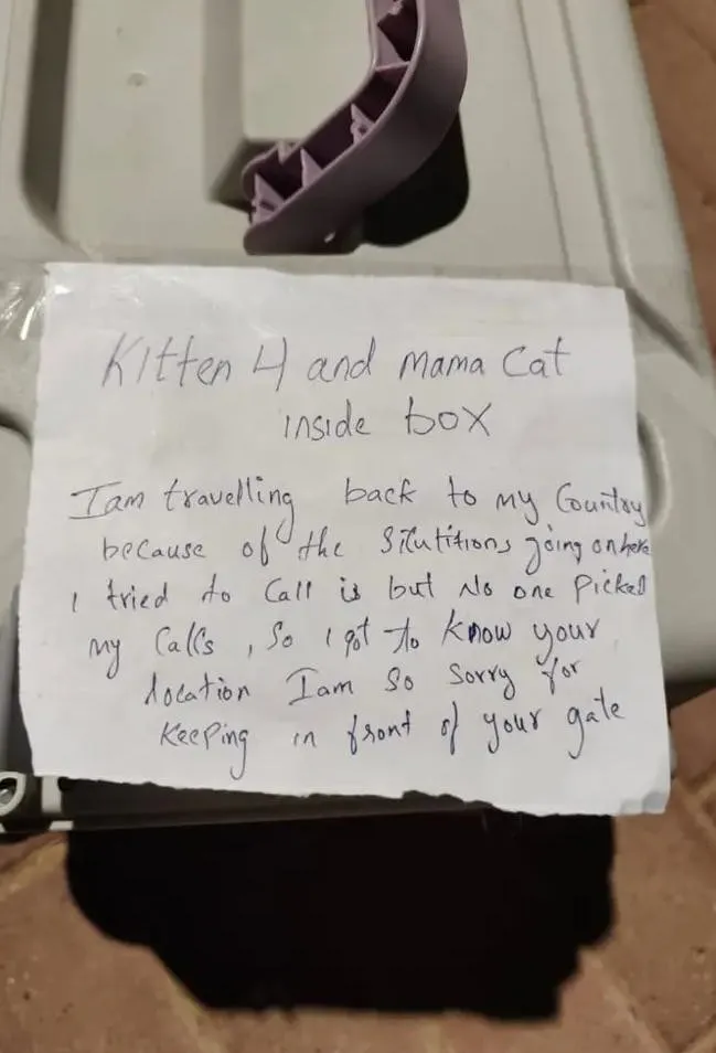 알아인(Al Ain)에서는 한 주민이 집 밖에서 우리를 발견했습니다. 그 안에는 어미 고양이 한 마리와 새끼 고양이 네 마리가 있었습니다. 손으로 쓴 메모에는 주인이 출국해서 데려갈 수 없다는 내용이 적혀 있었습니다.