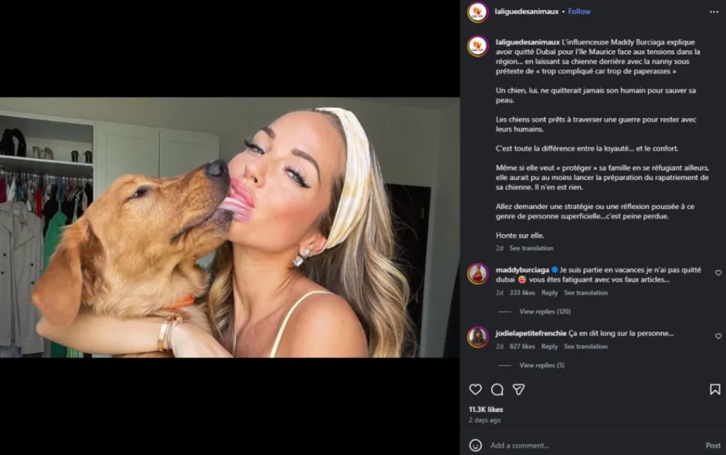 가장 비판받는 인물 중 하나는 프랑스 리얼리티 TV 스타 매디 부르시아가(Maddy Burciaga)입니다. 그녀는 가족과 함께 두바이를 떠나 모리셔스로 갔으며 유모의 보호에 개를 남겨둔 것으로 알려졌습니다.