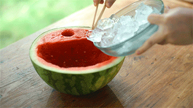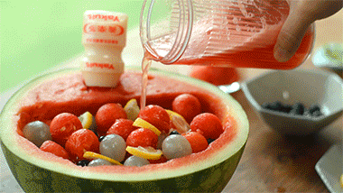 Encha a tigela oca de melancia com cubos de gelo, bolas de melancia, longan descascado, mirtilos e rodelas de limão. Despeje o suco de melancia reservado por cima de tudo (se tiver sifão de refrigerante, gaseifique primeiro). Decore com folhas de hortelã. À medida que o Yakult escorre lentamente na tigela, os sabores se fundem em uma bebida de festa doce, picante e espumante.