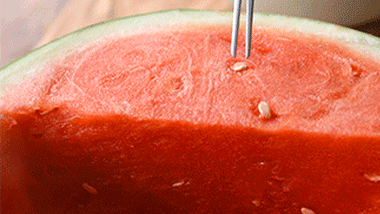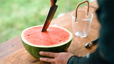 Na seção menor de 1/4, use um pauzinho ou cabo de colher para fazer um túnel diagonal através da carne. Em seguida, use o boleador de melão para esculpir um semicírculo na abertura – isso irá segurar a garrafa de bebida.