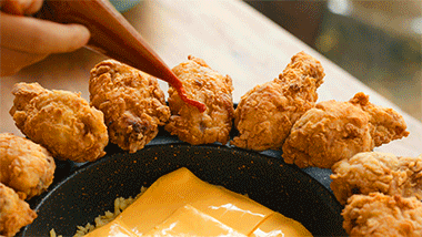 Disponha o frango frito na borda da panela de queijo – asas picantes de um lado e lisas do outro. Mantenha a panela em fogo baixo para manter a textura pegajosa do queijo enquanto come. Mergulhe cada asa no queijo derretido. Puxar. Observe a cachoeira.