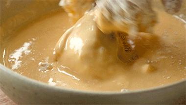 Em outra tigela, misture 1/3 da mistura de cobertura para fritar com ovos e leite. Bata até ficar homogêneo e sem grumos.