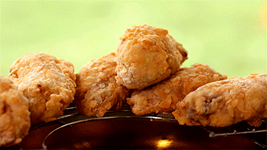 Aqueça o óleo de milho em uma panela pequena a 180°C (350°F). Adicione cuidadosamente os pedaços de frango revestidos. Frite por 30 segundos sem mexer para fixar a cobertura e, em seguida, vire suavemente de vez em quando. Frite até dourar. Retire e escorra sobre uma gradinha.