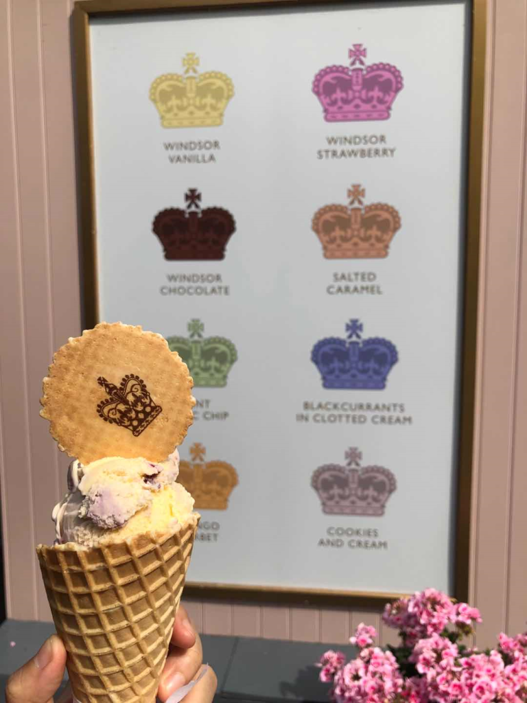 • 在溫莎城堡,一份簡單的軟冰淇淋上裝飾著一頂巧克力皇冠——一件小小的、可食用的皇室物品。