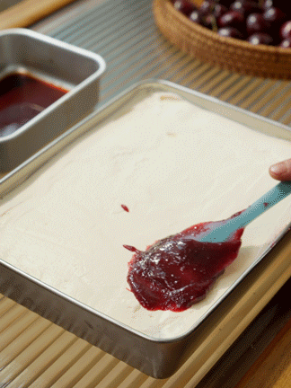 - 在手指餅乾上鋪上一層厚厚的自製櫻桃蜜餞。